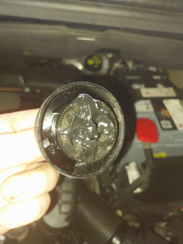 So sieht oft ein Motoröldeckel eines Motors aus, wenn hauptsächlich Kurzstrecken gefahren werden. Das Einhalten von den vom Hersteller vorgeschriebenen Serviceintervallen sind deshalb einzuhalten, um Schäden am Motor zu vermeiden.
